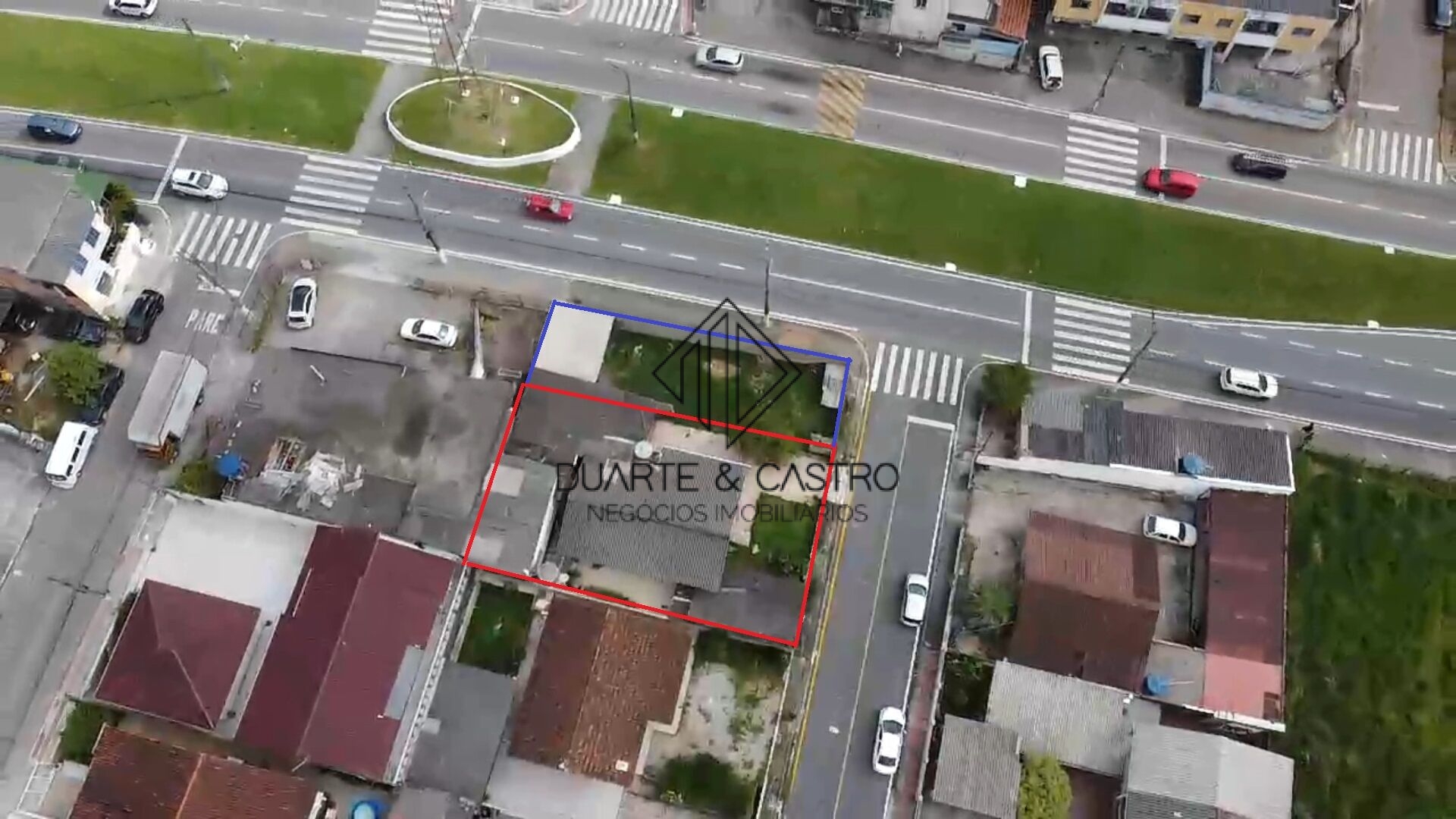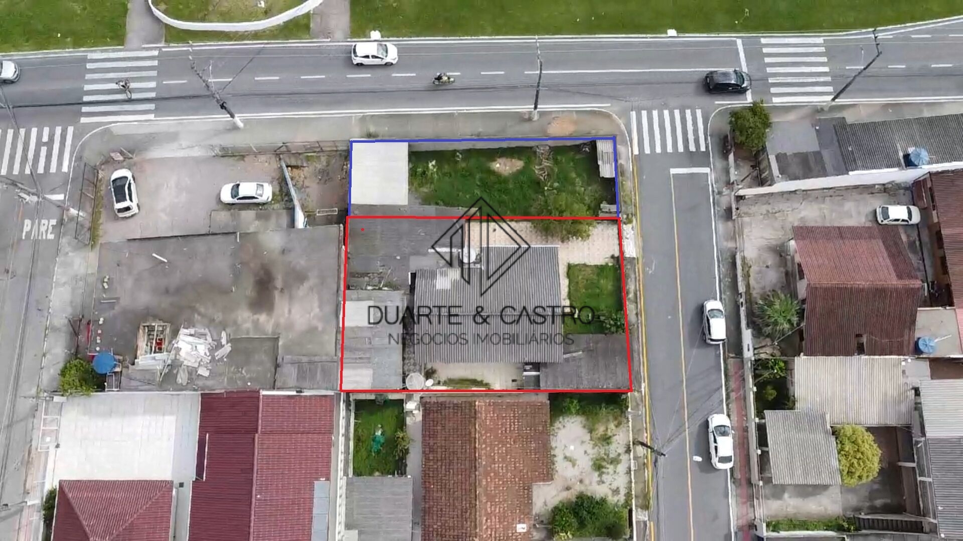 Área em vermelho escriturada, em azul área excedente de uso do terreno virado para avenida.